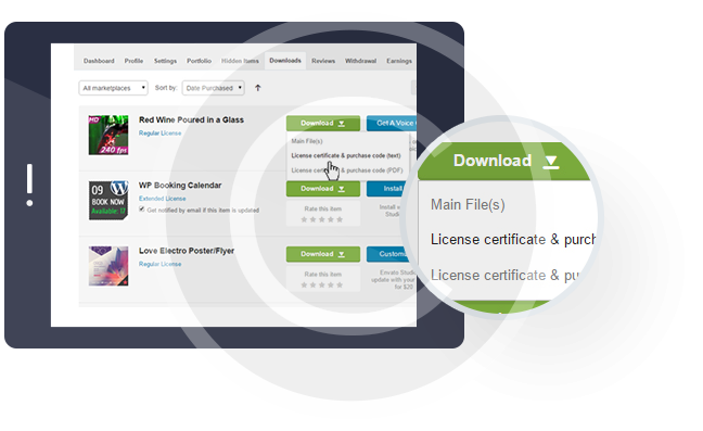 - Click „download” button, and in the drop-down menu select „license certificate & purchase code”.